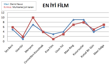 En hakkaniyetli dağılım bu gibi gözüküyor ama on filmin yarıştığı bir seçkide on kişiden oluşan büyük jürinin ödülleri paylaştırması ya da filmlere göre hakkaniyetli bir dağılım gözetmesi ne kadar doğru? Hiç değil! Bu tür dağılımlar filmleri, jürileri ve kurumları uzun vadede değersizleştiriyor. Yukarıda da görüldüğü gibi sinemaseverler ve izleyiciler her şekilde bu dağılımı yapıyor. Önemli olan büyük jürinin ince ince nakışı işlemesi ve en iyileri belirlemesi. Jüri bunun için oluşturulmuyor mu zaten.